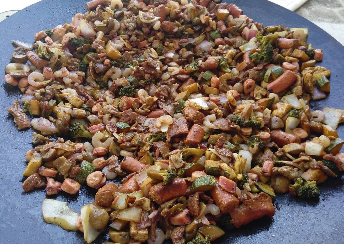 - Haz un hueco en el centro, coloca el tocino, luego las carnes a termino medio, mezcla con las verduras y revisa condimentos. Puedes agregar más salsas si el platillo lo pide.
