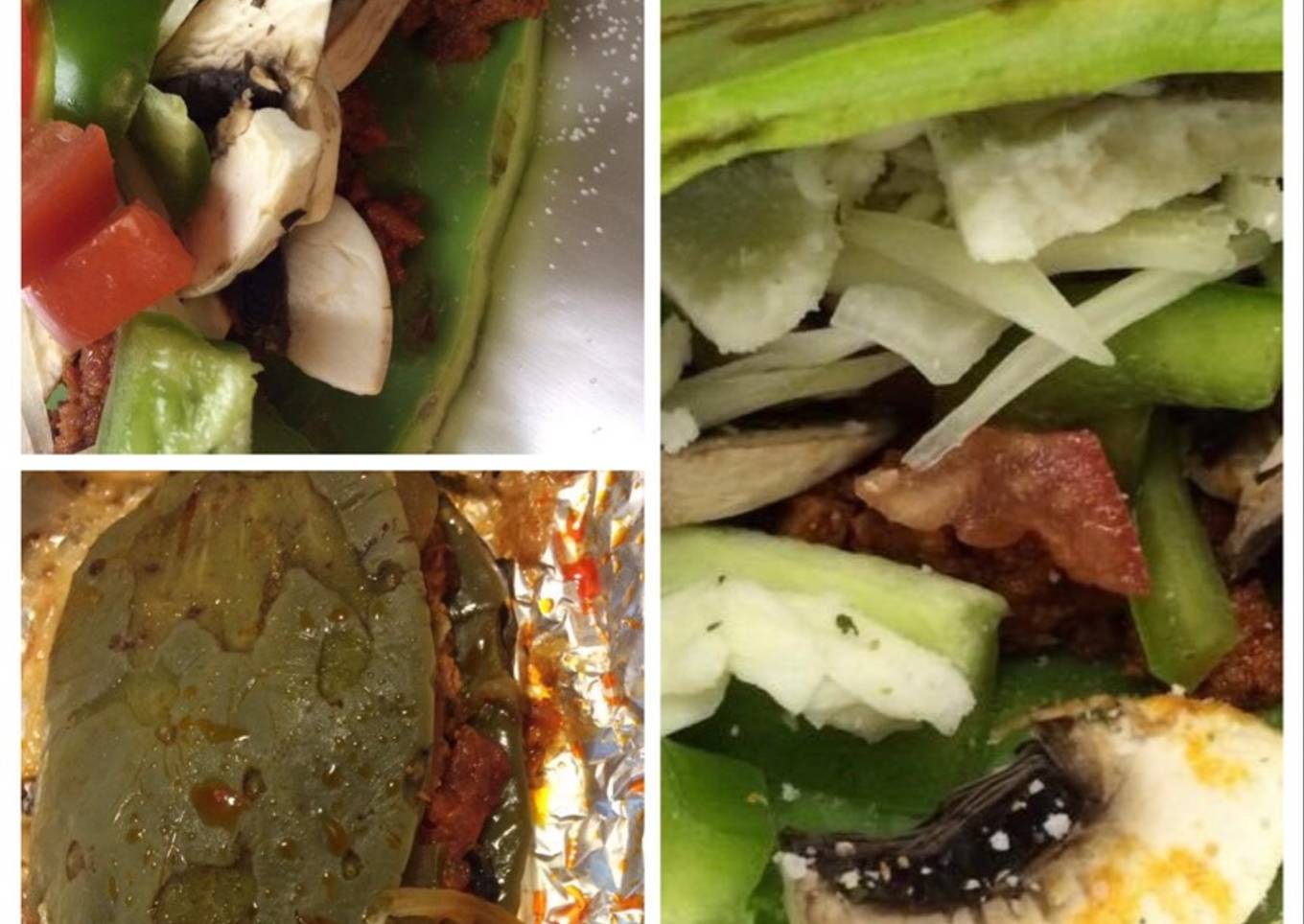 - Lavas los nopales y secas perfectamente, toma una lámina de alumio, y ponle sal de ajo un poco de cilantro y sal normal. Enseguida le pones longaniza, primero, hongos picaditos, bell paper, cebolla, tomate y quesos (fresco y mozzarella)