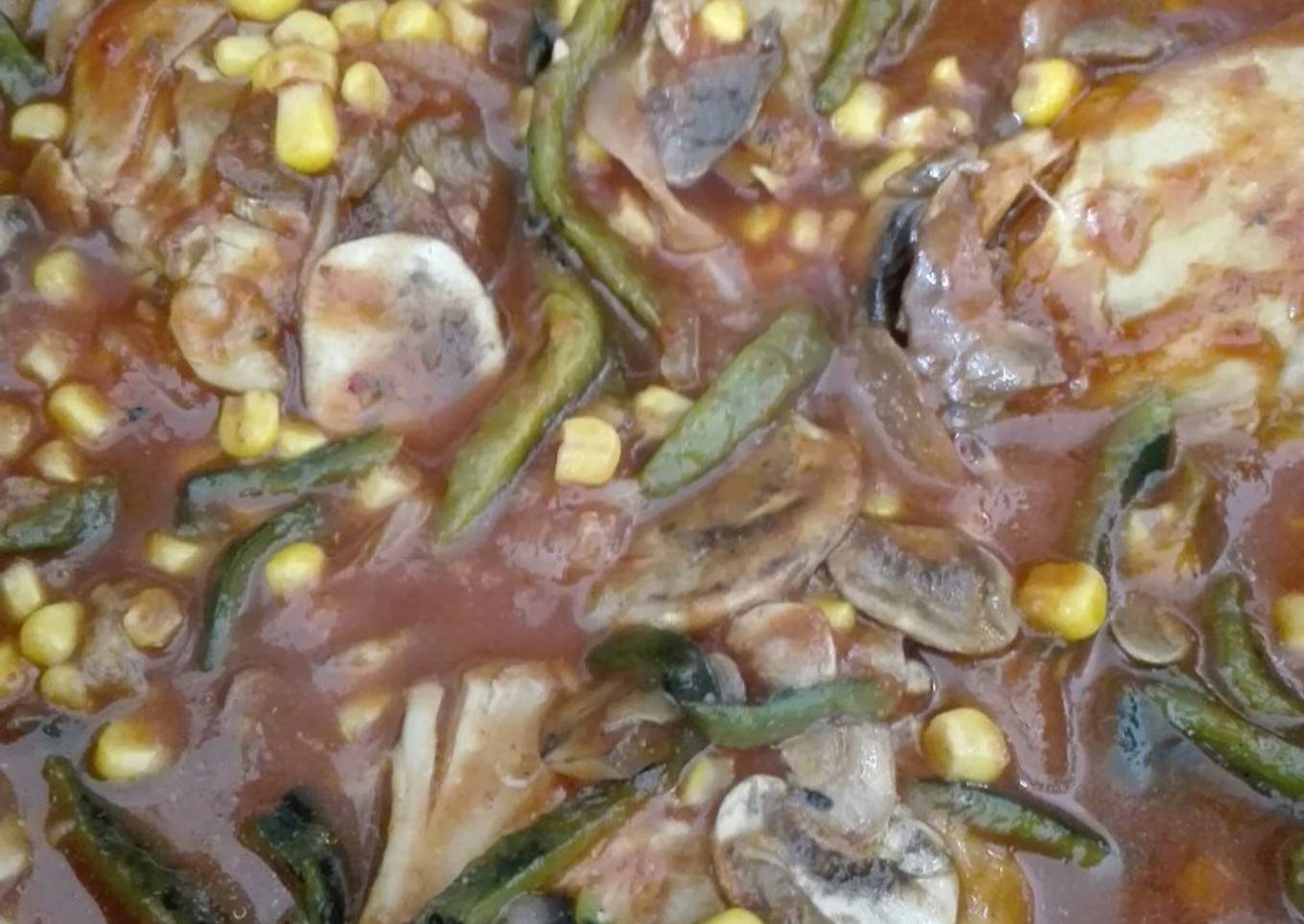 - Coloca en un sartén bien caliente unas gotas de aceite, agrega la cebolla fileteada, las piezas de pollo sin caldo, los champiñones y un poco de consomé de pollo en polvo. Deja que se dore un poco. Agrega las rajas y elotitos y revuelve.