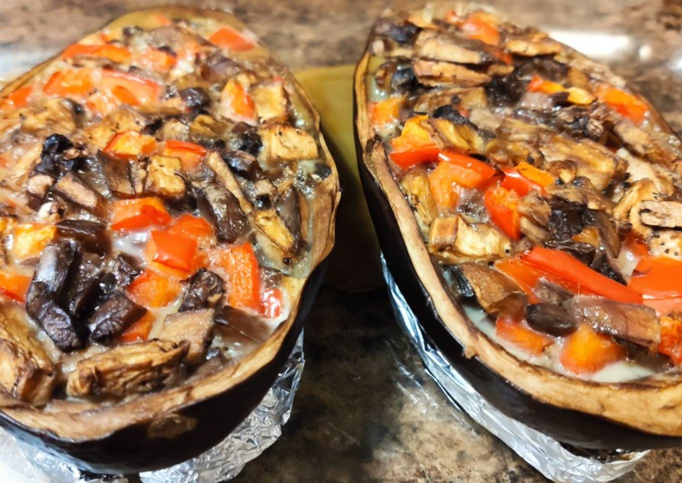 - Agregar la mezcla en cáscara de la berenjena y hornear por 30 minutos a 400°F.