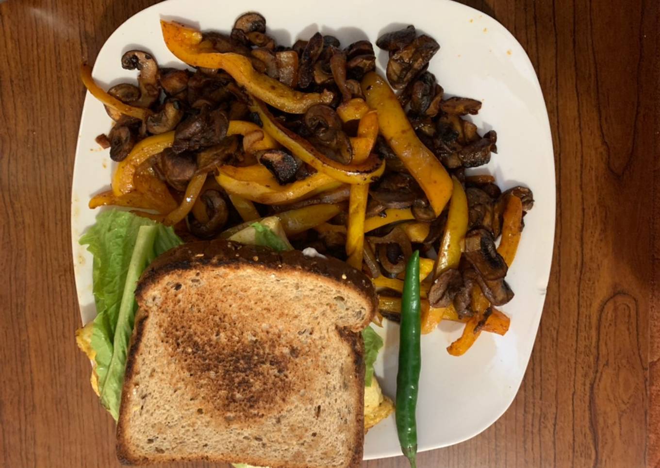 - Cuando hayas retirado los vegetales, ahí mismo pon el queso de tu preferencia, yo utilicé queso vegetariano tipo “marmoleado” y lo dejas derretir, al tiempo que lo cubres con una rebanada de pan de centeno.
