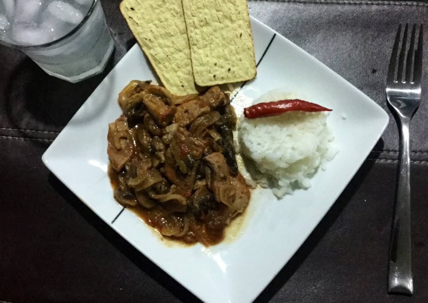 - Cuando la carne se encuentre bien cocida con los demás ingredientes se agregan los champiñones, el cubito de knorr, 3 chiles chipotles con un poco de jugo (estos son al gusto dependiendo de que tan picoso desees que quede) y sal al gusto.