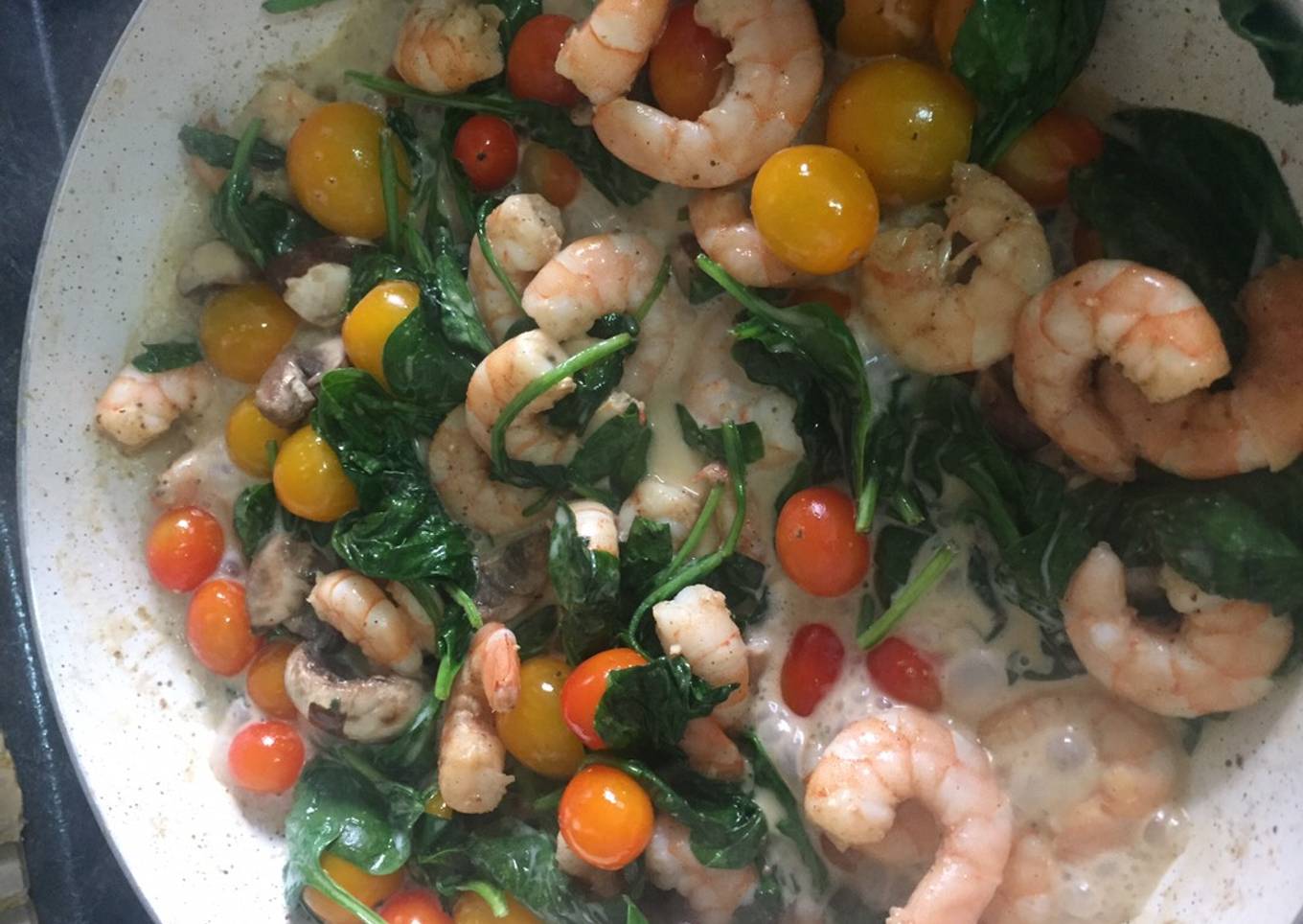- ...Agregar a los camarones el sazonado e, sal y pimienta y (cuando cambian de color) los champiñones, tomates y las espinacas...