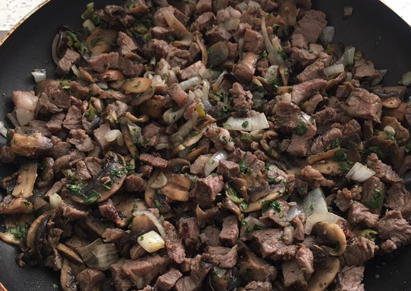 - Una vez que obtenga un tono traslúcido la cebolla, verter los champiñones. Sellar la carne en un poco de aceite sin dejar cocer por completo.