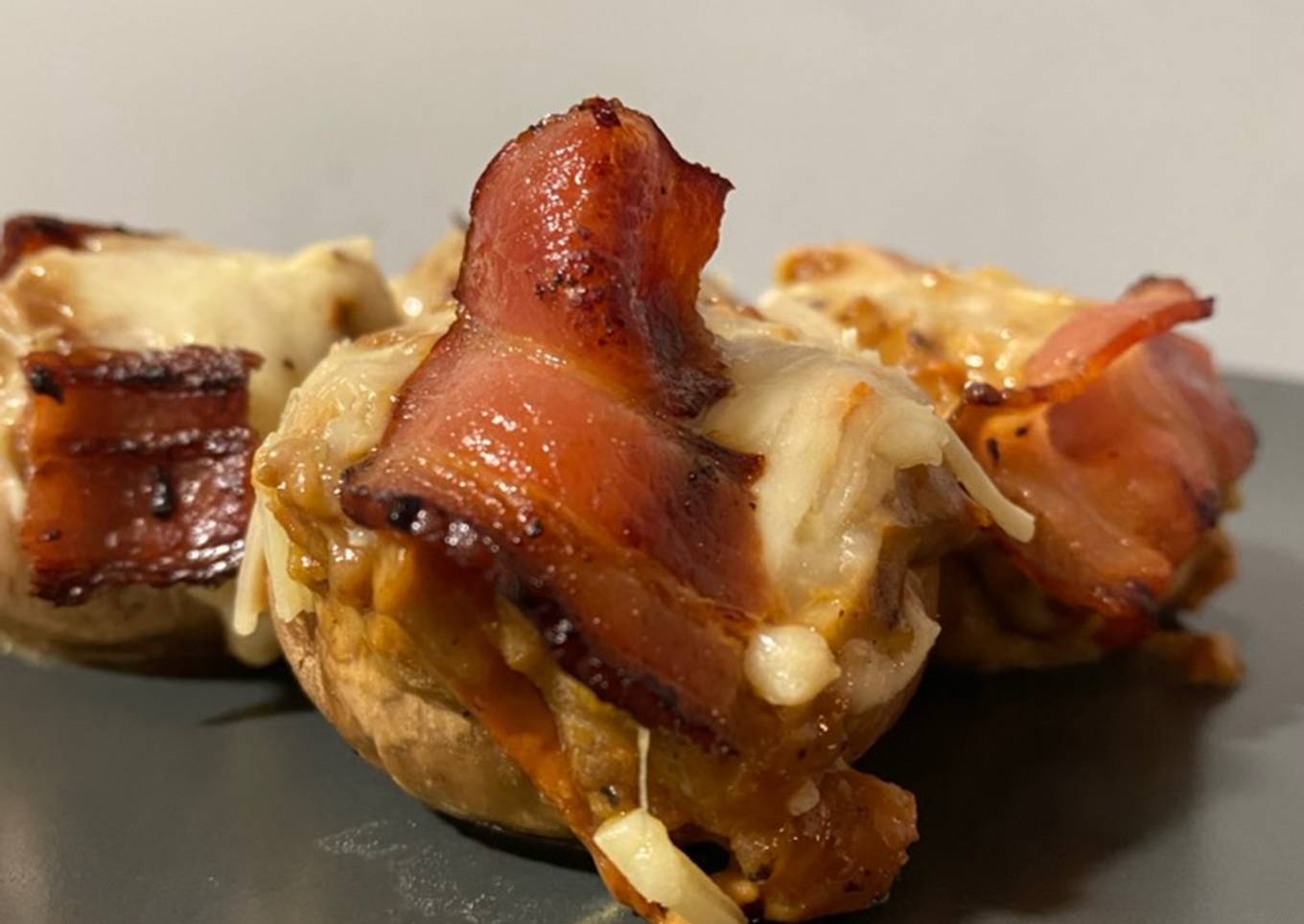 - Rellenamos los champiñones con la salsa y ponemos por encima un poco de mozzarella y una tira de bacon tostada en la sartén, que quede crujiente.