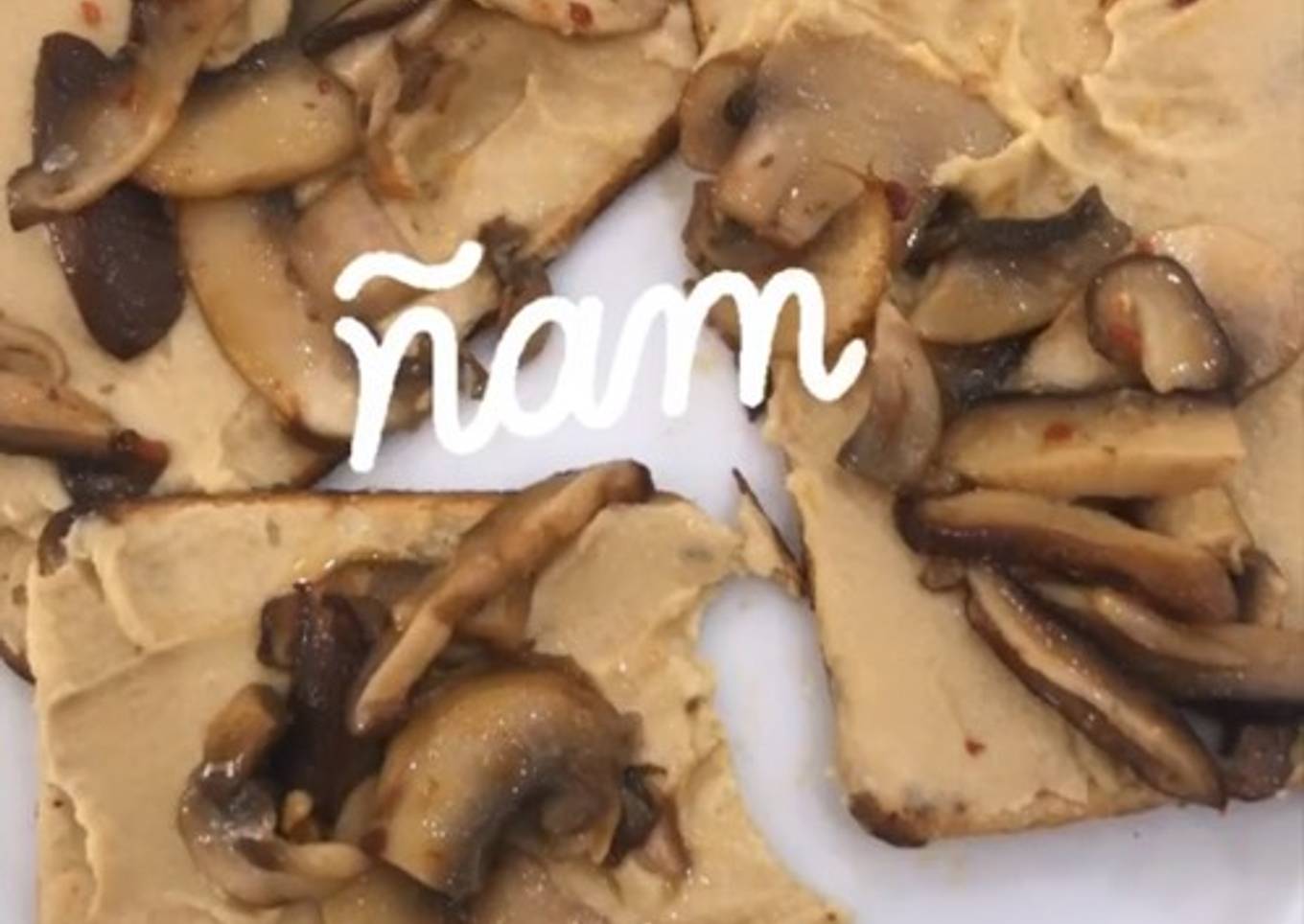 - Embarra tus tostadas con hummus y agrega los champiñones