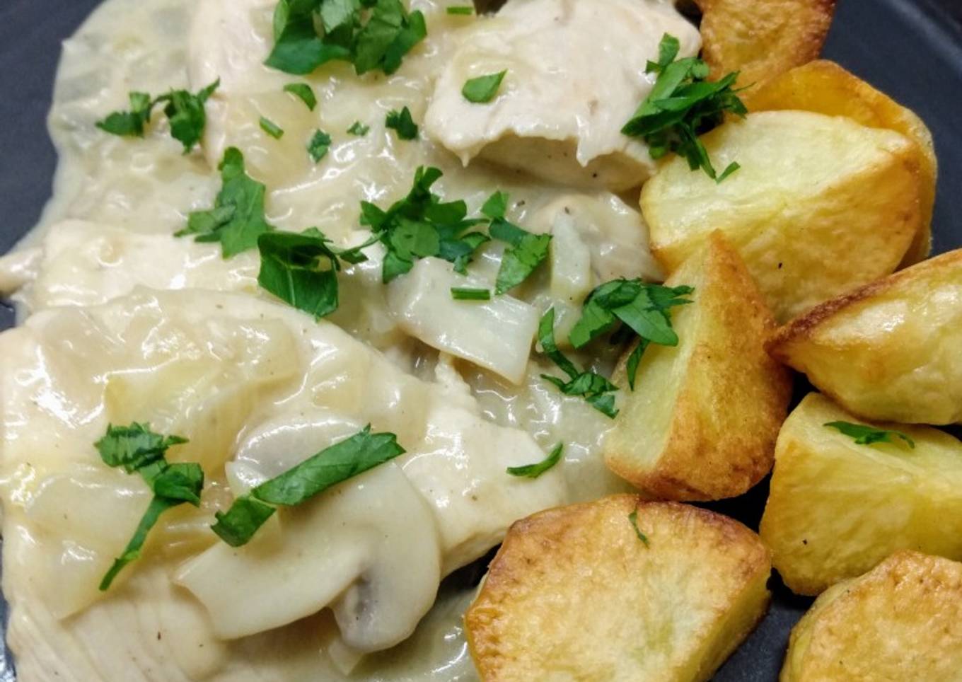 - Incorporar los champiñones y la pimienta. Cuando estén cocidos, agregar la leche y la nuez moscada. Disolver una cucharada grande de fécula de maíz en un poquito de leche fría y agregar a la preparación. Revolver hasta que espese. Rectificar sal y agregar el queso rallado, integrar. Incorporar el pollo, integrar por un minuto más y servir con papas o arroz y perejil picado.