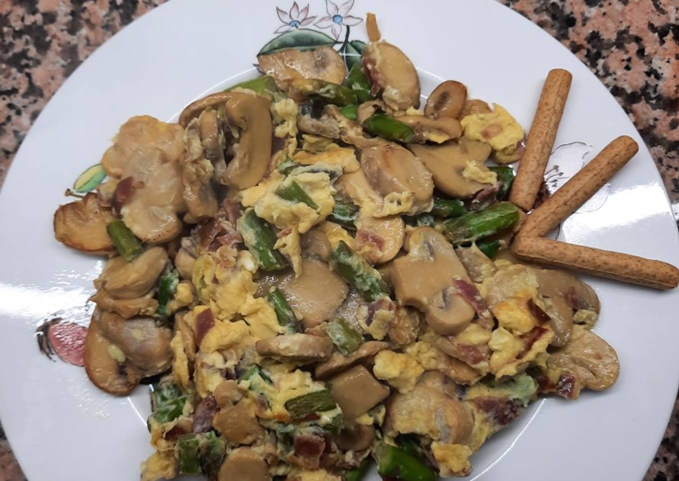 Revuelto de espárragos, champiñones y jamón