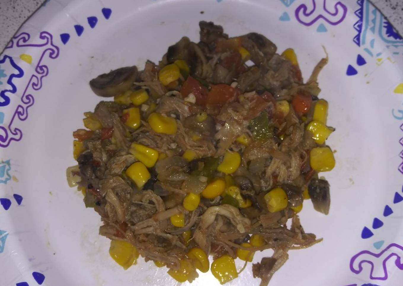 - Luego agregar los hongos y finalmente el elote. Agregar sal, pimienta y sazón complete al gusto. Luego agregar la carnita. Sofreír por 5 minutos más.