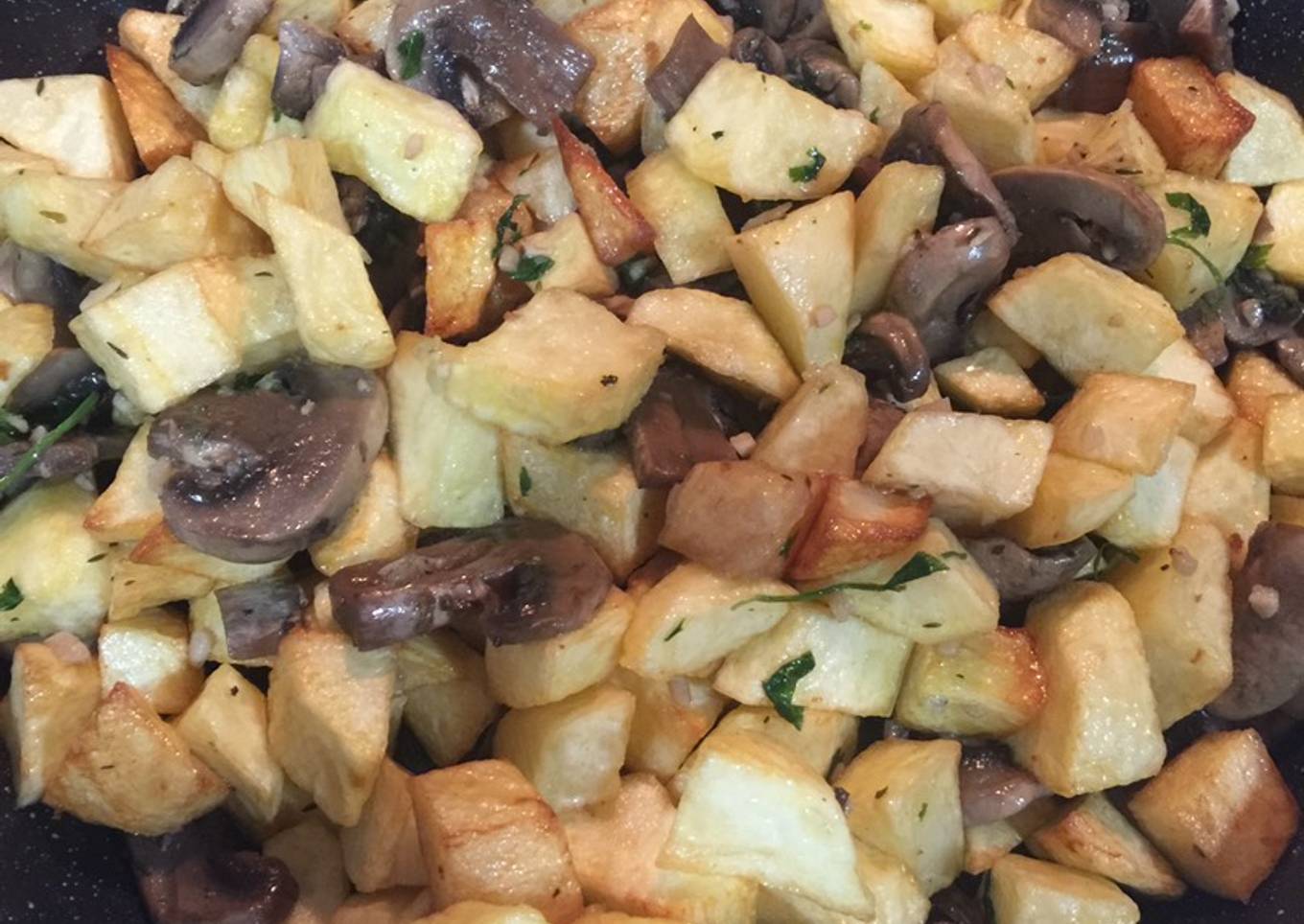 - Cuando esté los champiñones se le añade las patatas fritas y salteamos todo junto unos minutos y listo.
