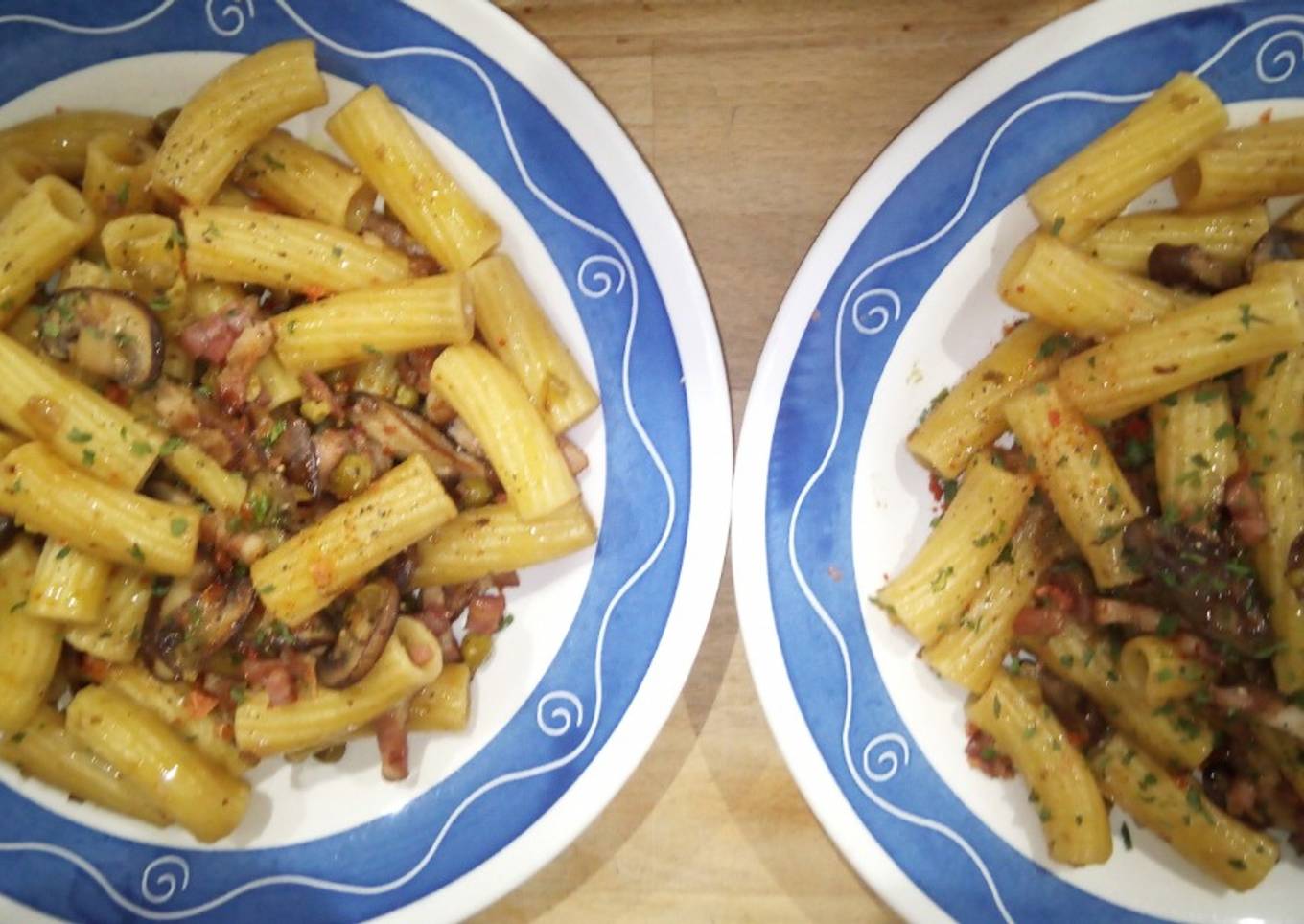 Elicoidali con Champiñones y Shiitake, Guisantes Bacon y Jamón